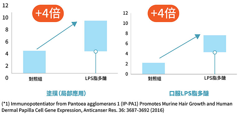 研究更加發現,不論外搽還是內服LPS脂多醣,其育髮成效更媲美醫生處方米諾地爾(Minoxidil)。透過與對照組做比較,LPS脂多醣的頭髮生成分數高達4倍*,比其他育髮成分來得優越。