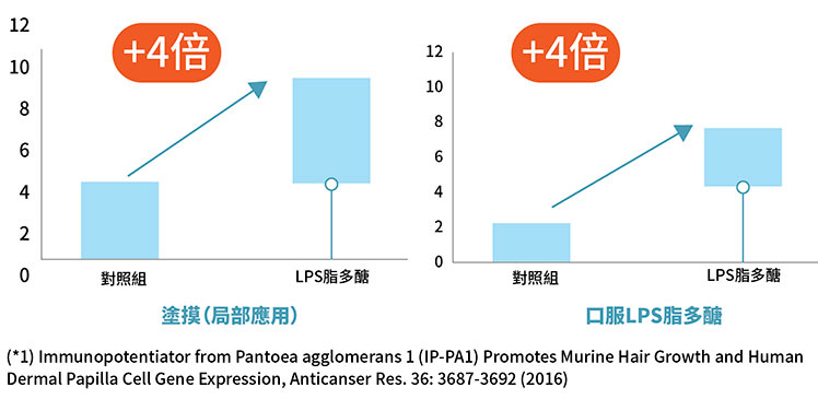從上圖的測試報告拍出,LPS脂多醣不論在外用或內服下,有著4倍育髮力。
